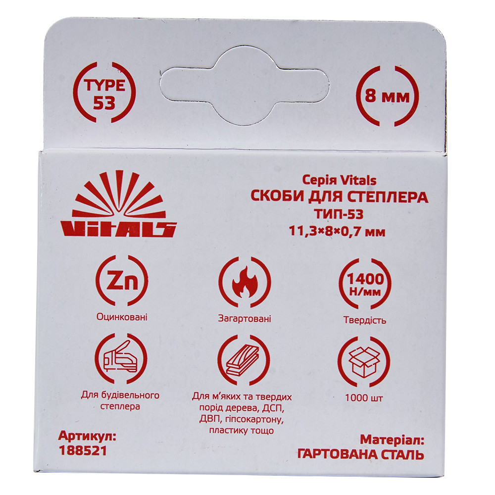 Особливості скоб для степлера тип-53 8 × 0,7 мм 1000 од. Vitals: